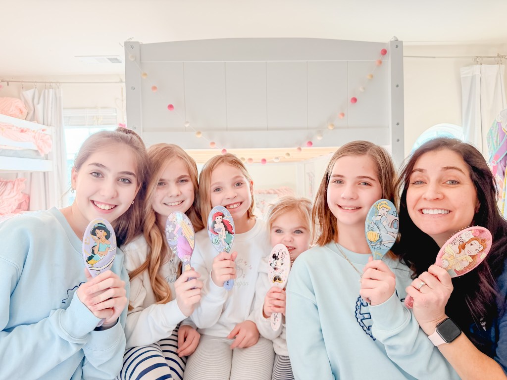 Who doesn’t love a fairy tale? At home, we LOVE the classic princess movies. In fact, each of us has our own princess we claim! For example, Jenna claims Aurora because of her blonde hair. If we can’t find Aurora, we will do Rapunzel because…the hair of course! LOL Raegan’s big, round blue eyes remind me of Ariel.