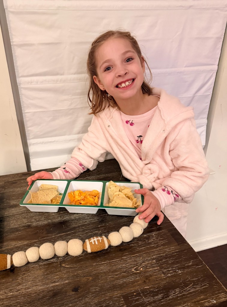 We all participated in making yummy food for Super Bowl Sunday! Raegan made the chips pretty!