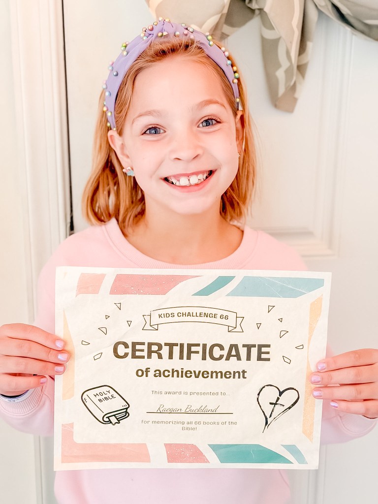 Raegan was super proud she memorized the 66 books of the Bible and received her certificate!